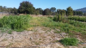 I was given something of a “personal morning” and finally made it outside at 11:00. I brought the push mower (http://www.billygoat.com/Product-Categories/Detail/high-weed-mower-residential-commercial) out and walked along the lines of sprinklers to try to make a visible path so I wouldn’t bump into the sprinklers or their poles. I had two sets of two beds to do (see https://farmingmum.com/wp-content/uploads/2015/09/20150920_104052.jpg?w=300) – one had been mowed before and not watered much after – I think it had been mostly buckwheat, and I think one part is going to be a Junebearing strawberry bed. As I got near the end of a bed of super-green sorghum-sudangrass, I started pulling out tall, mature pigweed plants. Somehow I lost my protective eye wear and I can’t find it again. That area is too wet to mow, anyhow, but I need to find those goggles.